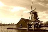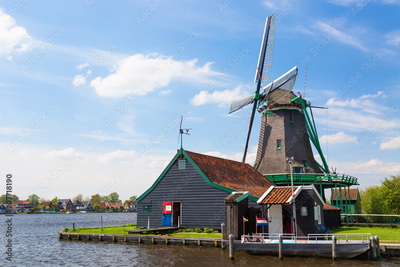 Dutch typical landscape. Traditional old dutch windmill against blue cloudy sky in the Zaanse Schans