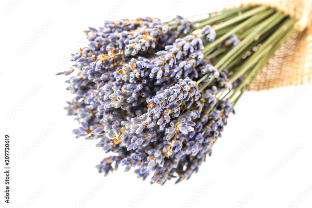 Small bouquet of dried lavender isolated on white background.