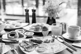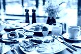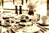 Setting of breakfast includes coffee, fresh orange juice, eggs on table in hotel restaurant