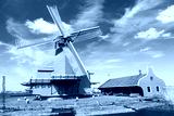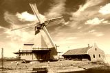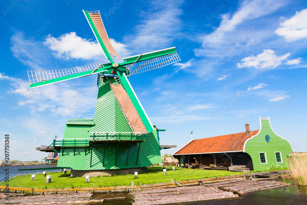 Dutch typical landscape. Traditional old dutch windmill against blue cloudy sky in the Zaanse Schans village, Netherlands. Famous tourism place.