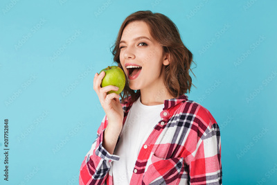 Pretty lady in plaid shirt eating green apple and happily winking looking in camera over colorful blue background