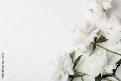 Beautiful white peony flowers bouquet on pastel table top. Flat lay style.