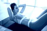 Portrait of thoughtful girl in sporty top and leggings lying on yoga mat and rock press while listening music in earphones at home with big windows on background
