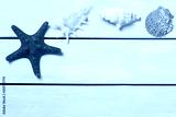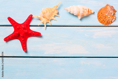Summer sea vacation background with shells and red star on a wooden blue background with copy space