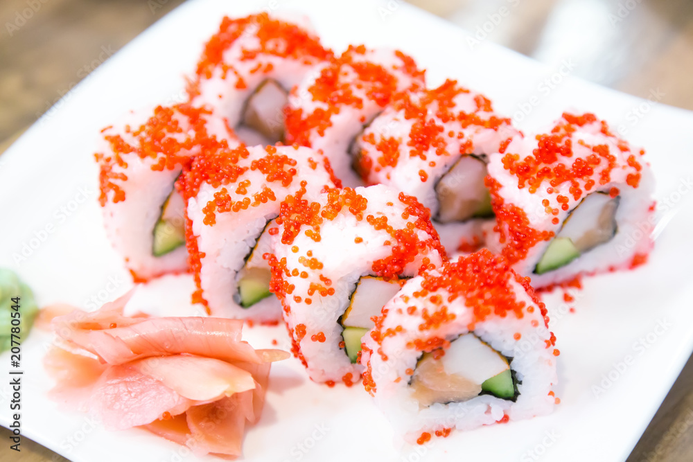 Asian menu. Californian sushi rolls with Masago caviar near ginger and wasabi on white plate. Japanese cuisine. Close up image.