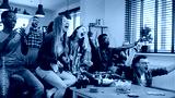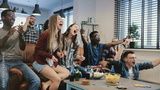 African American football fans celebrate winning. Wide shot. Passionate team supporters excited. Fun. 4K slow motion.