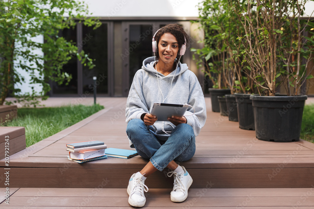 Young smiling lady sitting with headphones and tablet in hands and happily looking in camera in courtyard of university