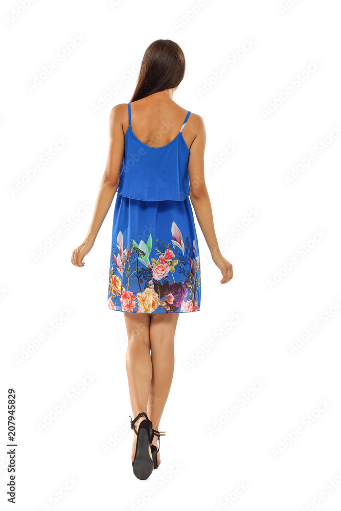 Young woman standing in model pose in short blue summer dress on white clean background. Fashion and modeling concept.