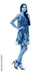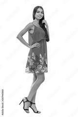 Young woman standing in model pose in red summer dress on white clean background. Fashion and modeling concept.