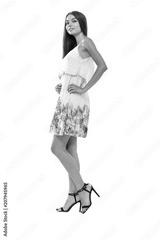 Young woman standing in model pose in white summer dress on white clean background. Fashion and modeling concept.