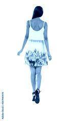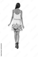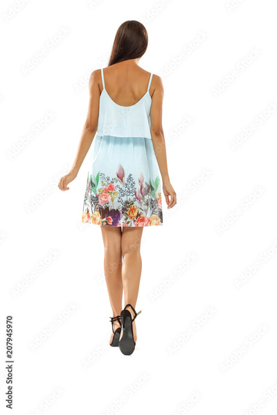 Young woman standing in model pose in white summer dress on white clean background. Fashion and modeling concept.