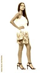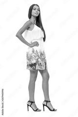 Young woman standing in model pose in white summer dress on white clean background. Fashion and modeling concept.