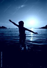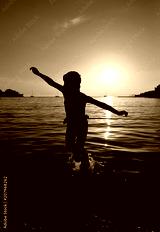Girl silhouette and sea. Cheerful little child girl jumping and hovering in the air on the background of sunset sky and Adriatic sea, Croatia. Child playing and having fun at the beach.