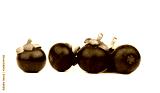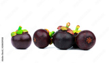 Whole mangosteen showing purple skin isolated on white background with space. Tropical fruit from Thailand. The queen of fruits. Asia fresh fruit market concept. Natural source of tannin and xanthones
