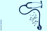 Green stethoscope with pile of capsule pills isolated on white background with copy space. Medical tool for doctor. Health check up concept. Medical equipment. Clinical Cardiology concept.