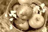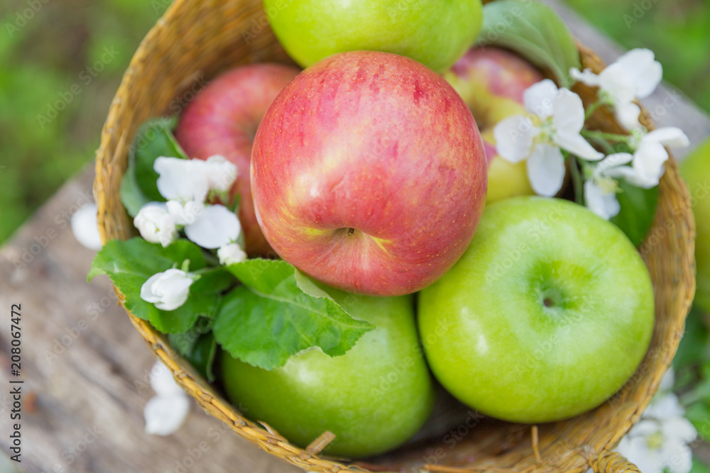 Fresh sweet juicy red and green apples with flowers on a wooden background in garden