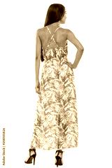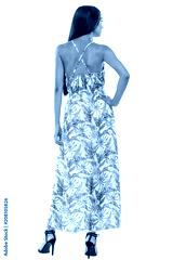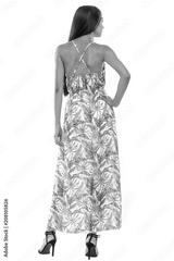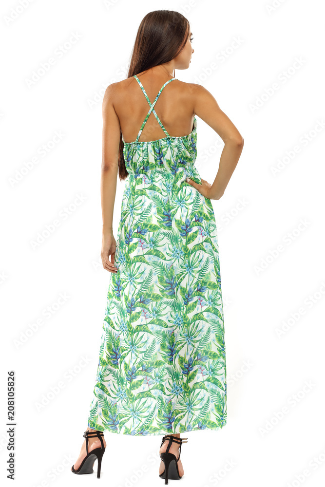Model woman in long summer dress on white clean background. Fashion and modeling concept.