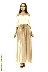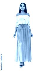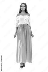 Model woman in white summer blouse and long skirt on white clean background. Fashion and modeling concept.
