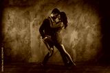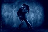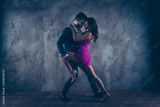 Full size fullbody portrait of romantic lovely couple, pretty lady in purple tight dress gentlemen in tuxedo, face to face standing close in tango position, isolated on concrete background
