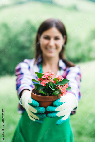 Woman holds in her hands small flowering plant with the vase during gardening day