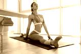 Close up photo of pretty lady in sporty top and leggings practicing fitness on yoga mat and listening music in earphones at home isolated