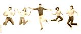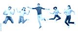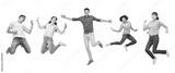 happiness, freedom, motion and people concept - smiling young international friends jumping in air over white background