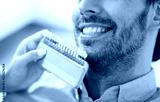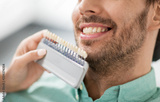 medicine, dentistry and healthcare concept - close up of dentist with tooth color samples choosing shade for male patient teeth at dental clinic