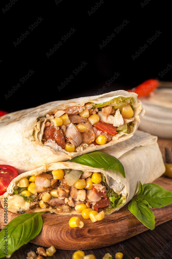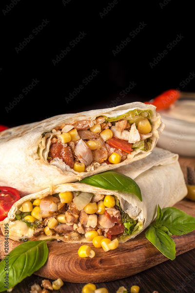 Burritos, kebab, shaurma wraps beef and vegetables on a black background and lies on a wooden board. Beef burrito, Mexican and oriental food.