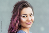 Portrait of gorgeous brunette with pink tones in her hair wearing festival makeup. Natural lighting, closeup, retouched.