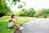 Beautiful asian woman is drinking electrolyte beverage or water during attractive beautiful woman is resting and sitting under a tree at public park. Charming beautiful girl lost sweat while exercise
