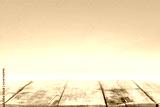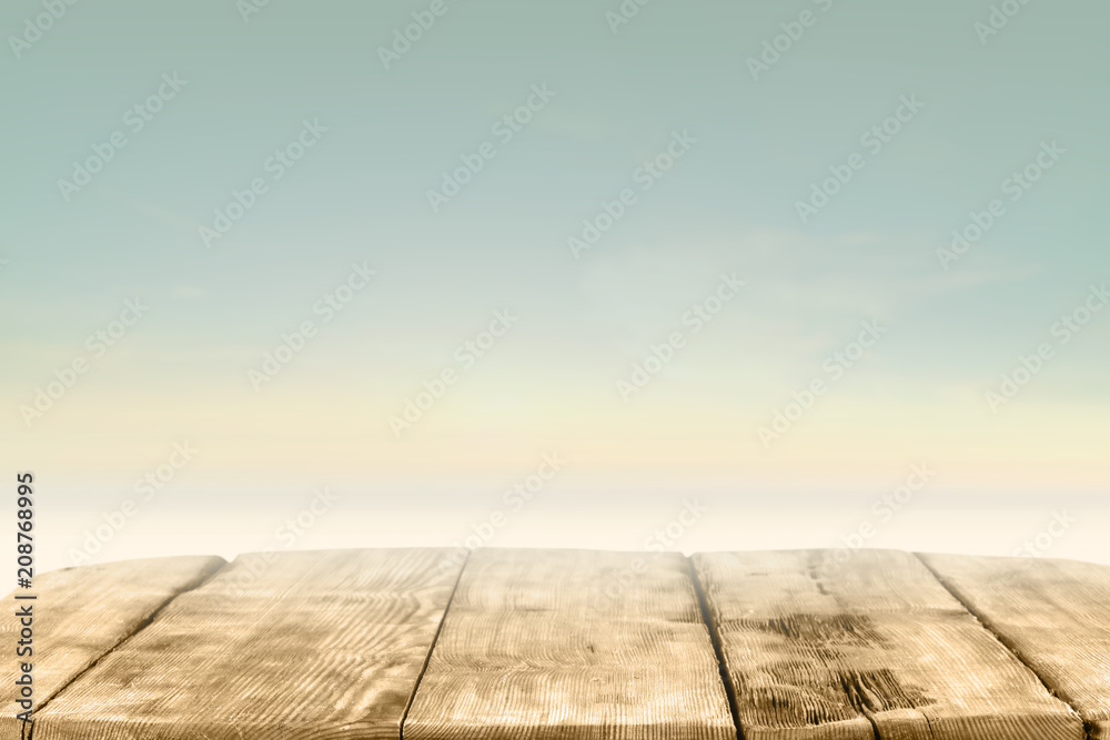 Empty wooden shabby chic table top with copy space for your decoration and products with blurred sea and sky in the moody mild sunset background.