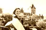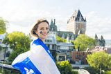 Woman celebrates the national holiday in front of Chateau Frontenac in quebec city