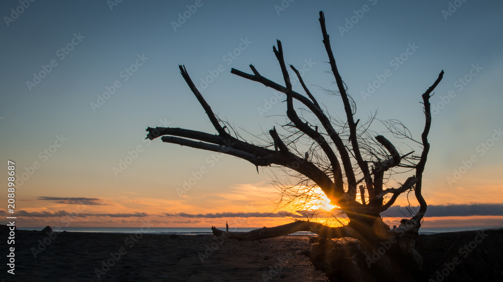 Fallen Tree trunks at Sunset, Taranaki, New Zealand