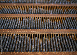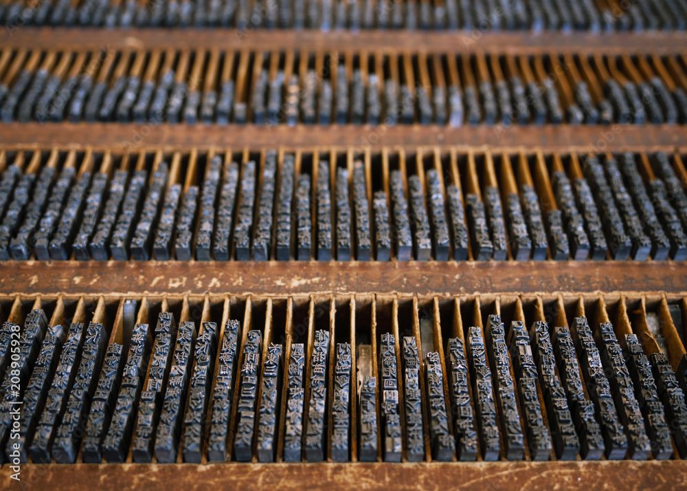 Printing press letter blocks in a wooden shelf Printing Industry