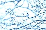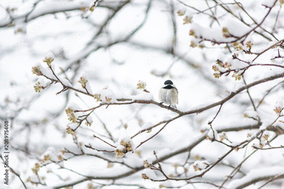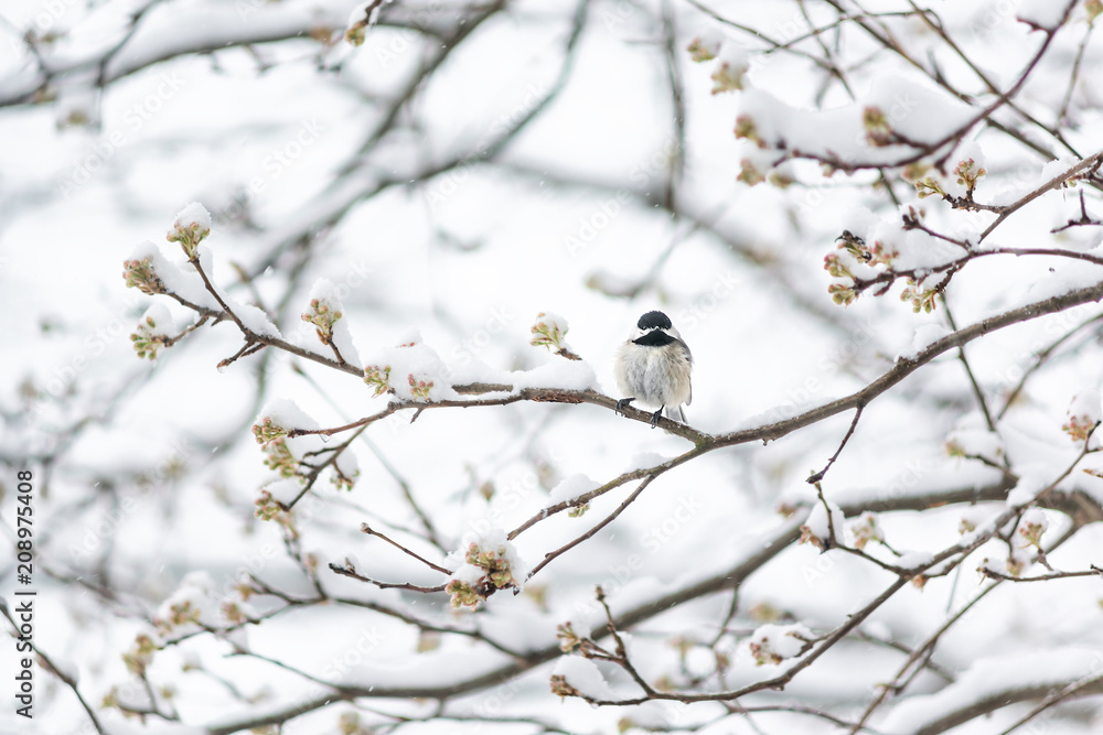 One small black-capped chickadee, poecile atricapillus, bird sitting perched on tree branch during heavy winter snow ruffling fluffing feathers cold in Virginia, snow flakes falling