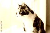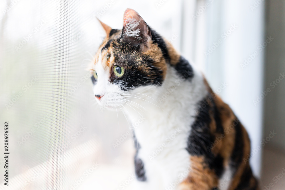 Female cute curious calico cat closeup of face sitting on windowsill window sill looking staring behind curtains blinds outside