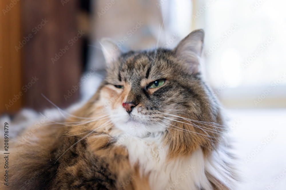 Closeup of Maine Coon calico cat face with focus on bloody cut nose after fighting, with green blinking eyes