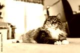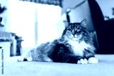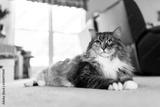Playful cute maine coon calico cat closeup lying down on carpet floor indoor house living room by couch sofa