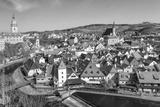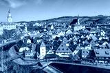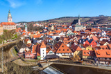 Aerial view panorama of the old Town of Cesky Krumlov in South Bohemia, Czech Republic with blue sky. UNESCO World heritage Site and famous place for tourism