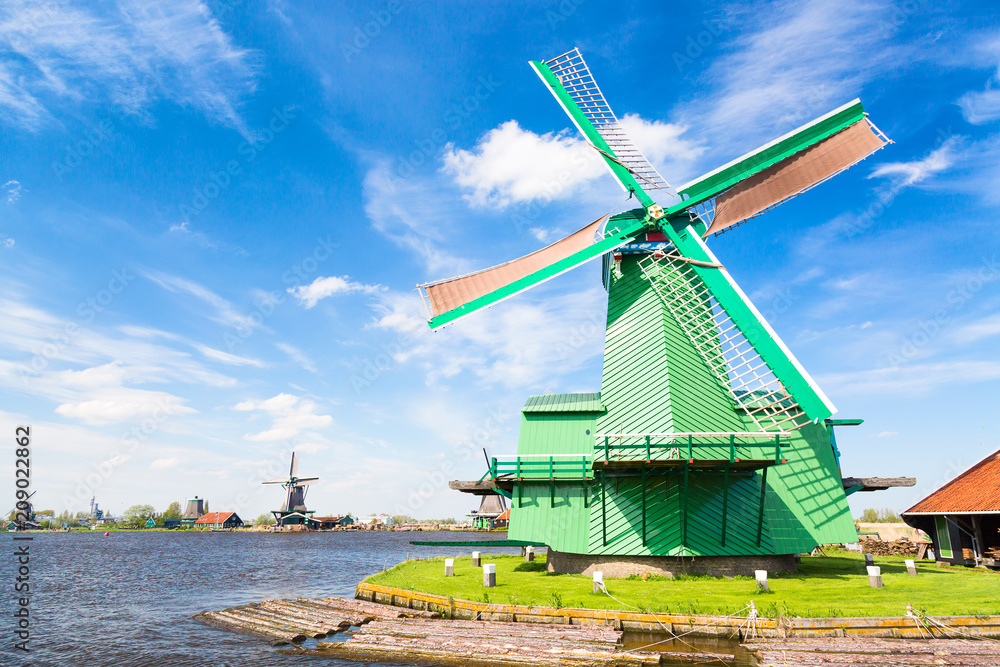 Dutch typical landscape. Traditional old dutch windmill against blue cloudy sky in the Zaanse Schans village, Netherlands. Famous tourism place.