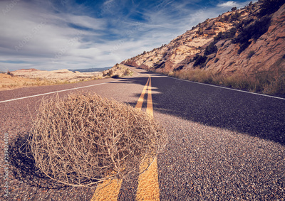 Tumbleweed on a road, color toned picture, Capitol Reef National Park, Utah, USA.
