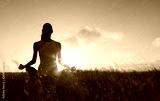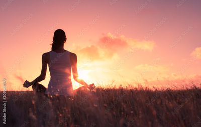 Peaceful quiet meditation. Woman meditating in a grass meadow.