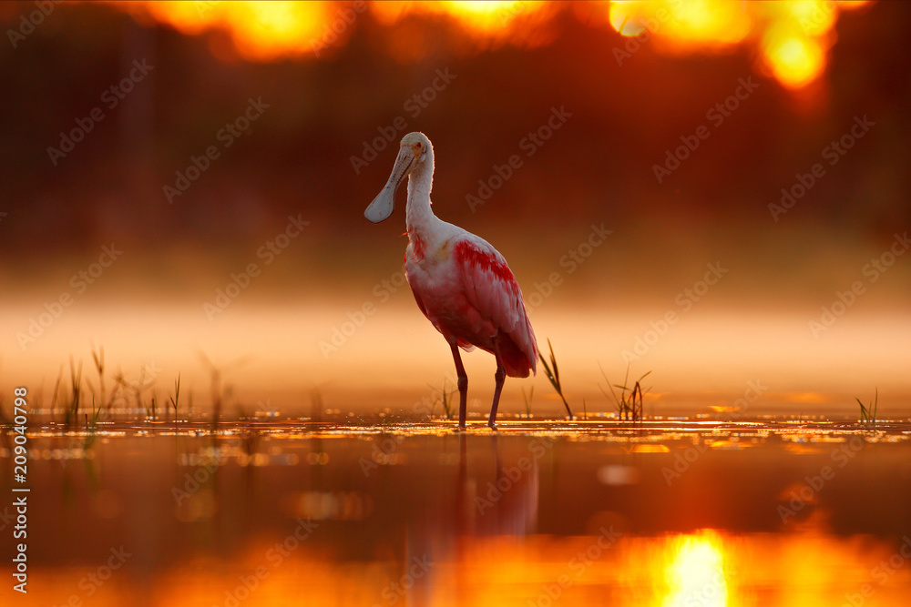 Beautiful sunrise with bird, Platalea ajaja, Roseate Spoonbill, in the water sun backlight, detail portrait of bird with long flat bill, Pantanal, Brazil. Animal in foggy nature, morning sunset.