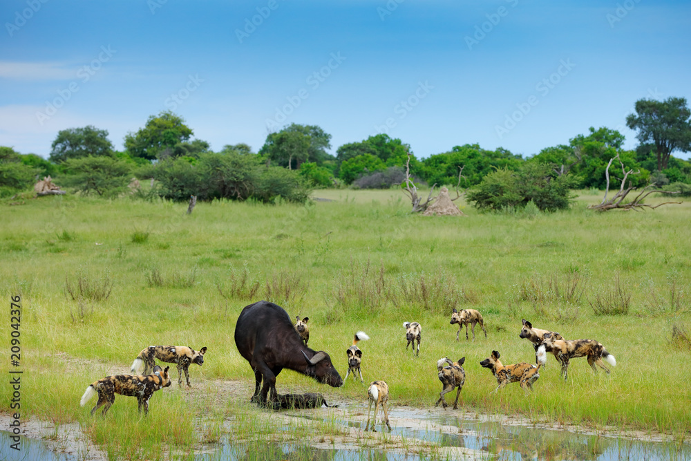 Wild Dog Hunting in Botswana, buffalo cow and calf with predator. Wildlife scene from Africa, Moremi, Okavango delta. Animal behaviour, pack pride of African wild dogs offensive attack on calf.