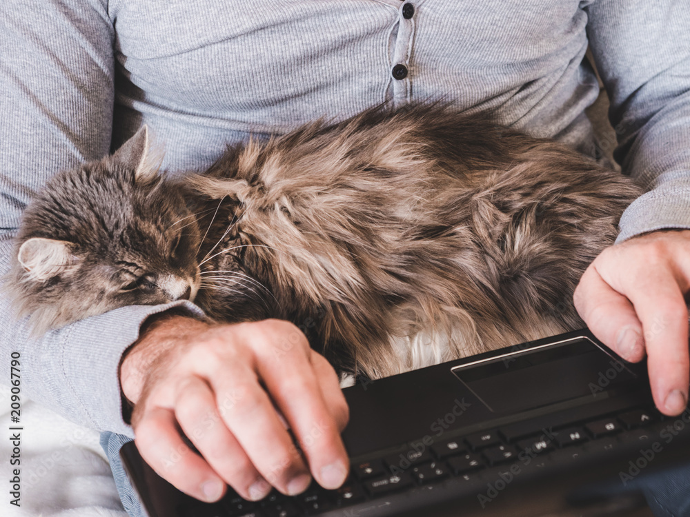 Men's hands, laptop and a gentle, cute kitten. Top view, close-up. People, pets, care