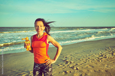 Fitness woman running by the beach at sunrise. Healthy active lifestyle girl exercising outdoors