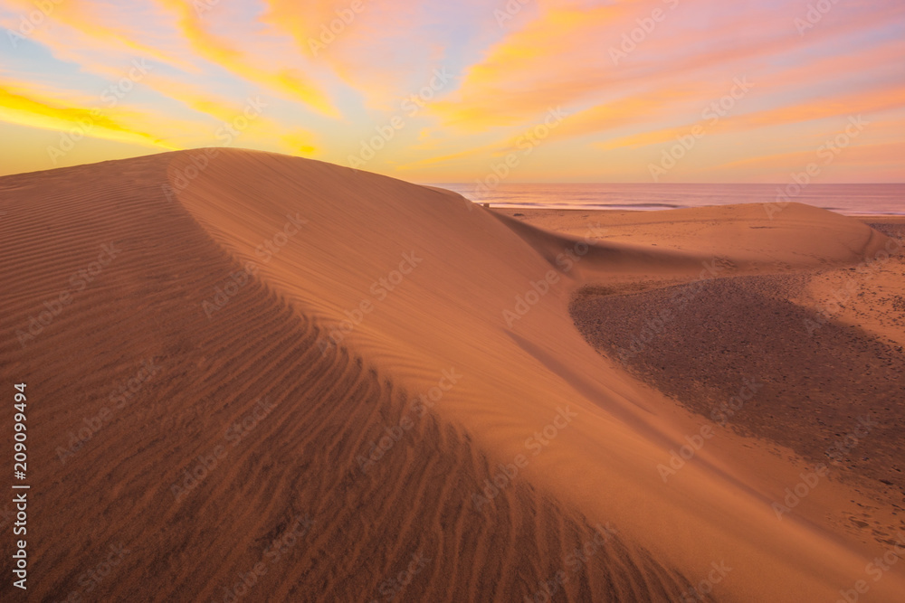 Famous natural park Maspalomas dunes in Gran Canaria at sunrise, Canary island, Spain