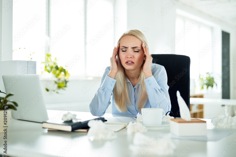 Young businesswoman suffering headache in the office