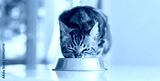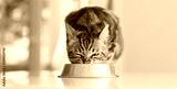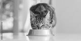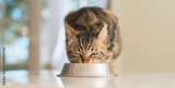 Beautiful feline cat eating on a metal bowl. Cute domestic animal.