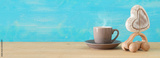 Image of hot coffee or tea next to toy car with heart over wooden table. Father's day concept.